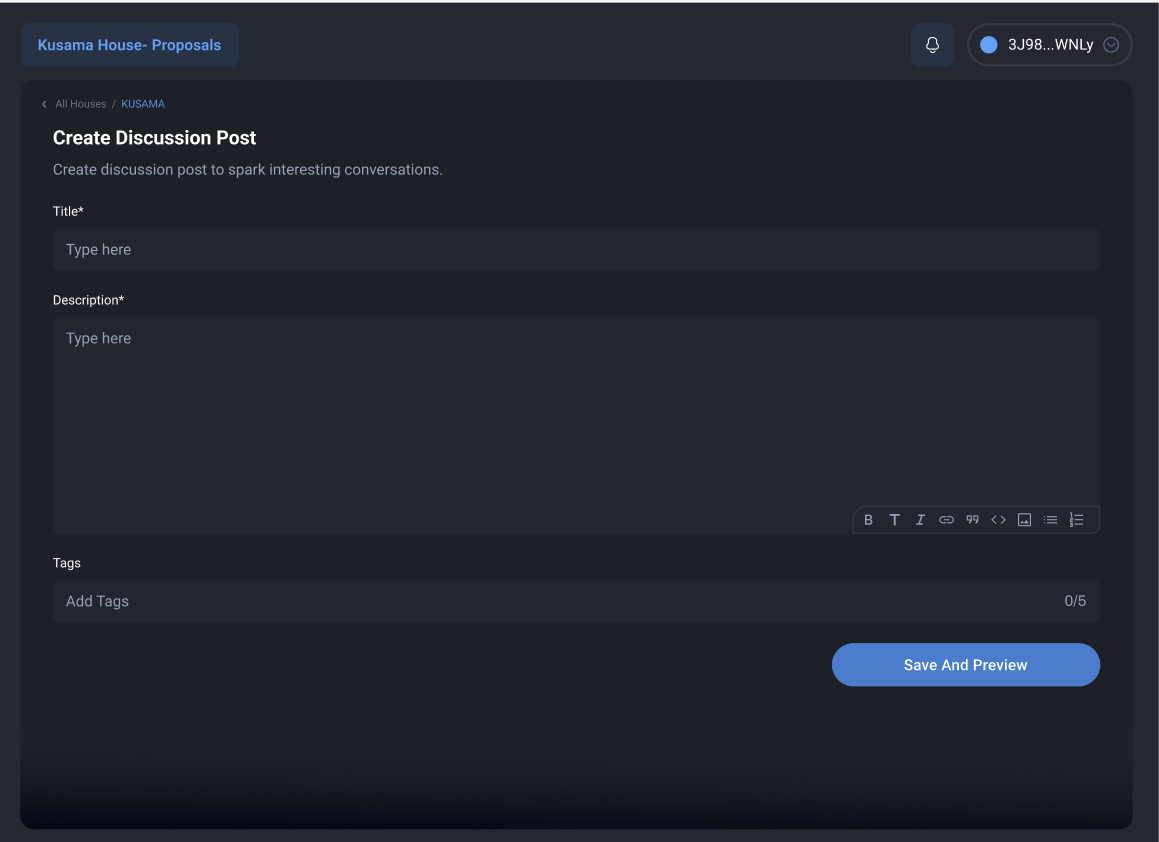You can start a discussion directly through your social feed. Alternatively you can navigate to a house and create discussion by following the steps below.